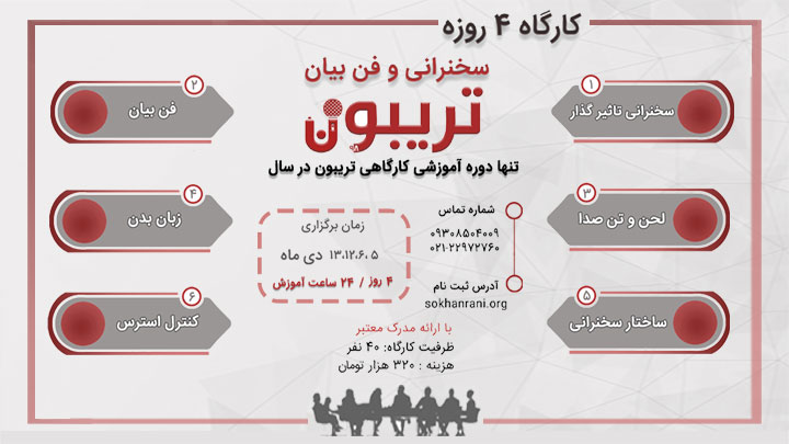 دوره آموزش سخنوری در 4 روز ( 5 , 6 , 12 , 13 دی ماه ) و با 24 ساعت محتوای آموزشی برگزار می‌گردد.